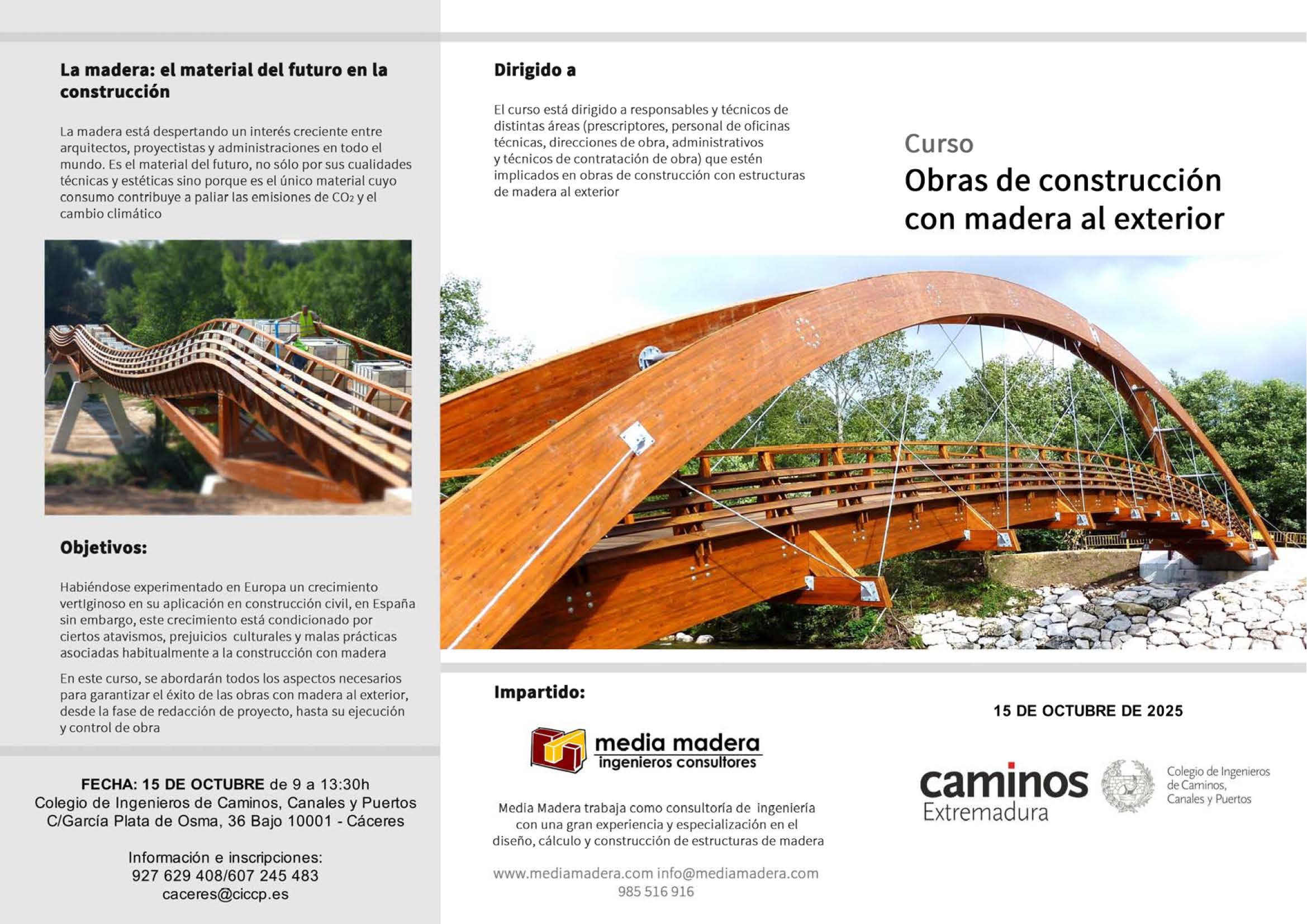 | FreeLa Demarcación de Extremadura del Colegio de Caminos, Canales y Puertos, organiza un Curso de Obras de construcción con madera al exterior, impartido por Media Madera Ingenieros Consultores.