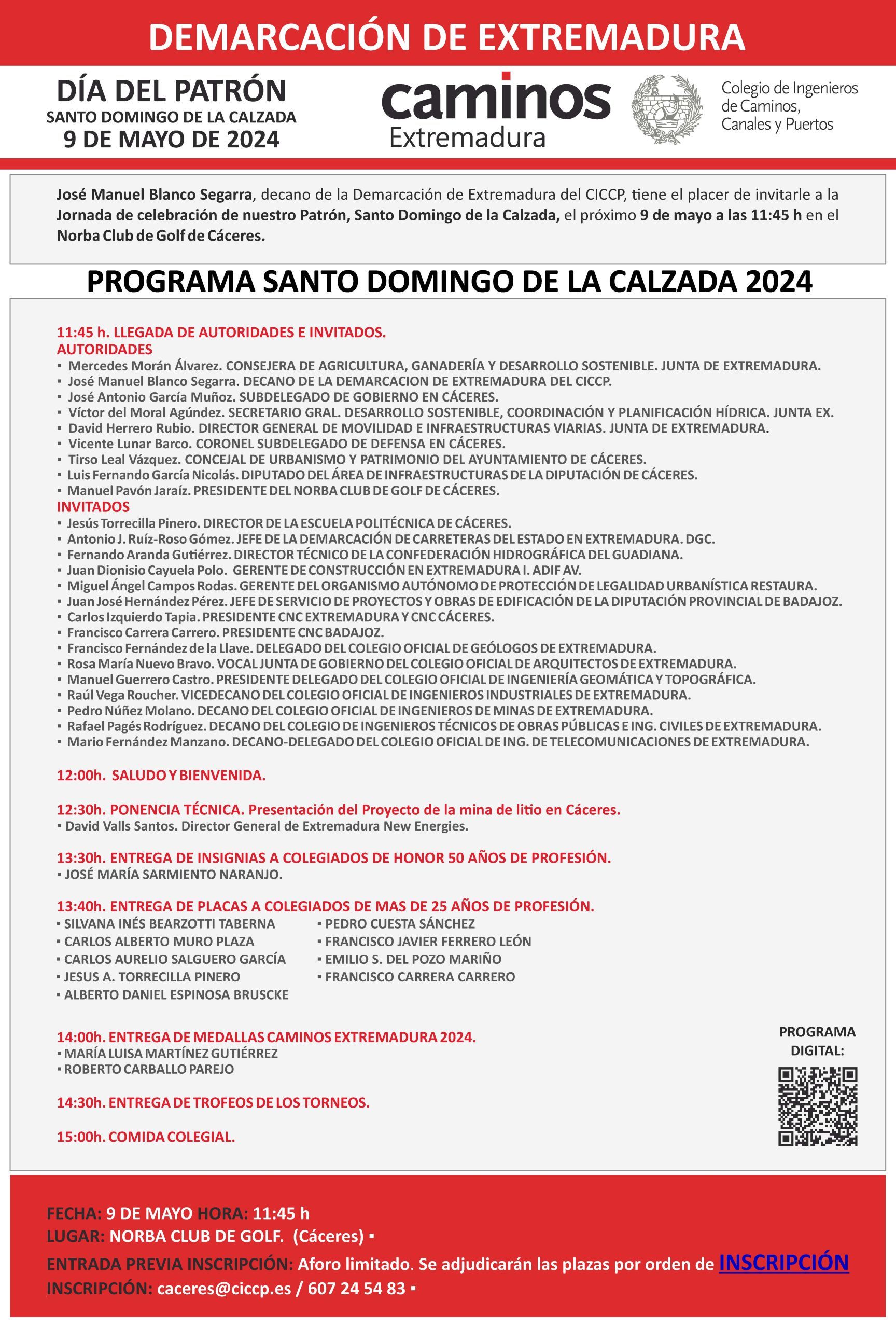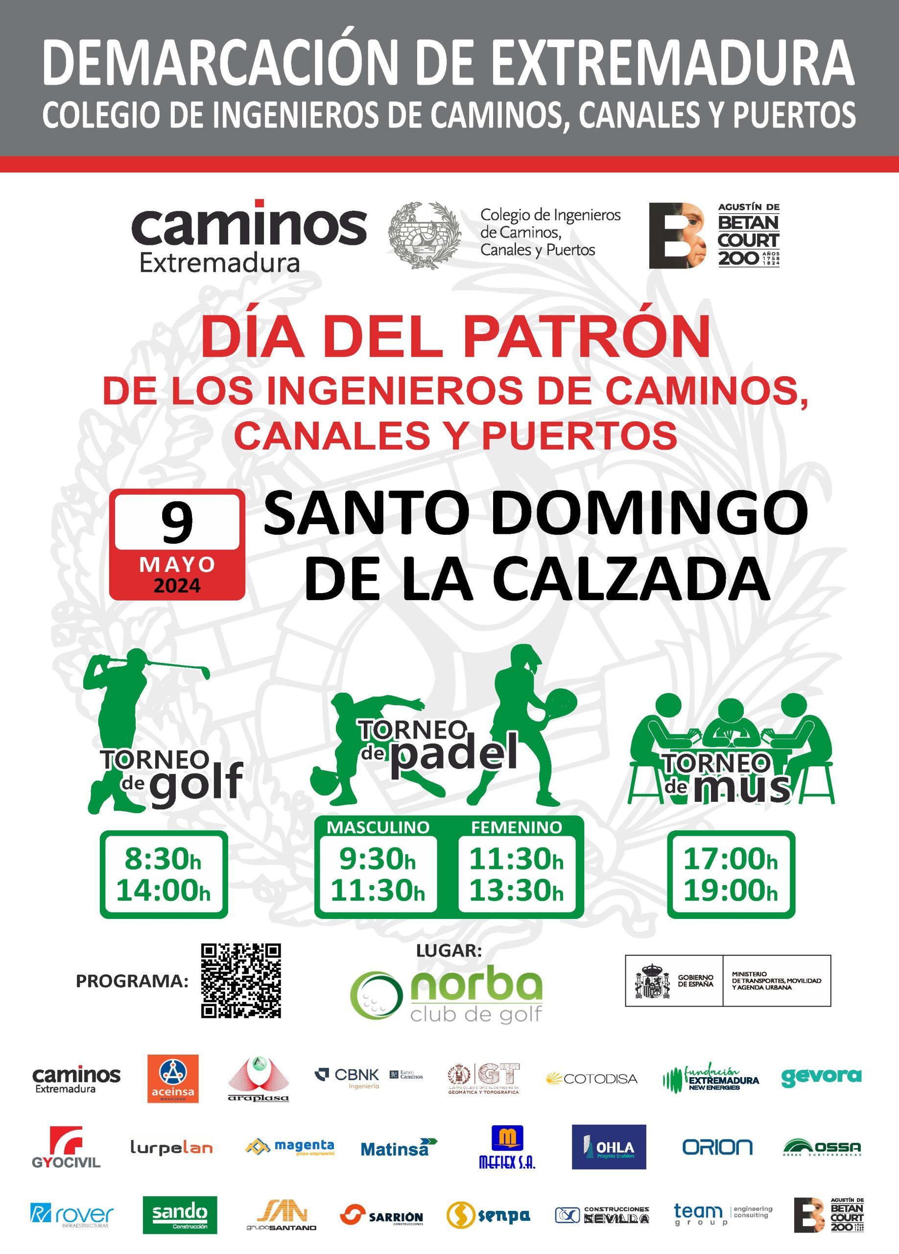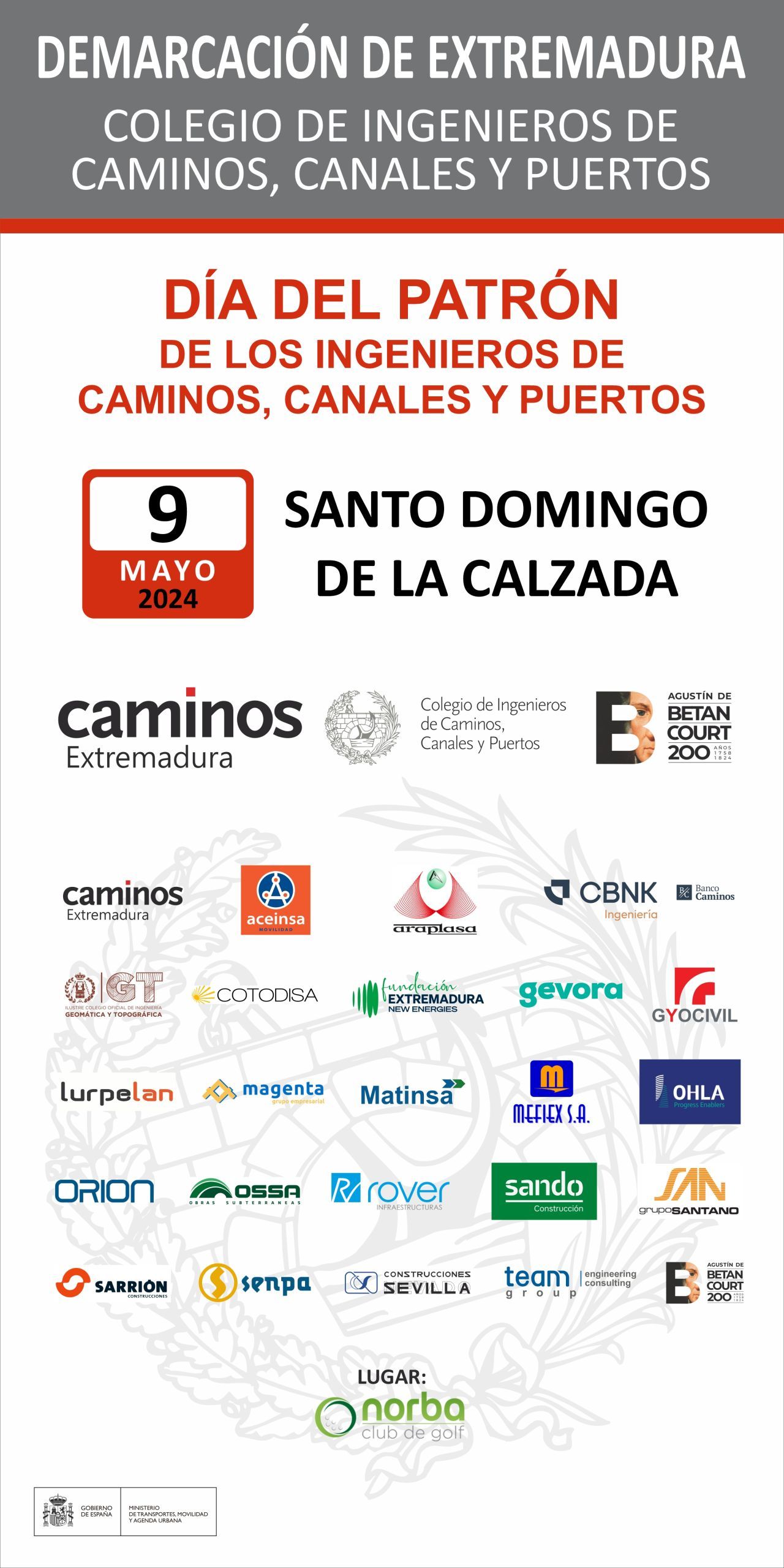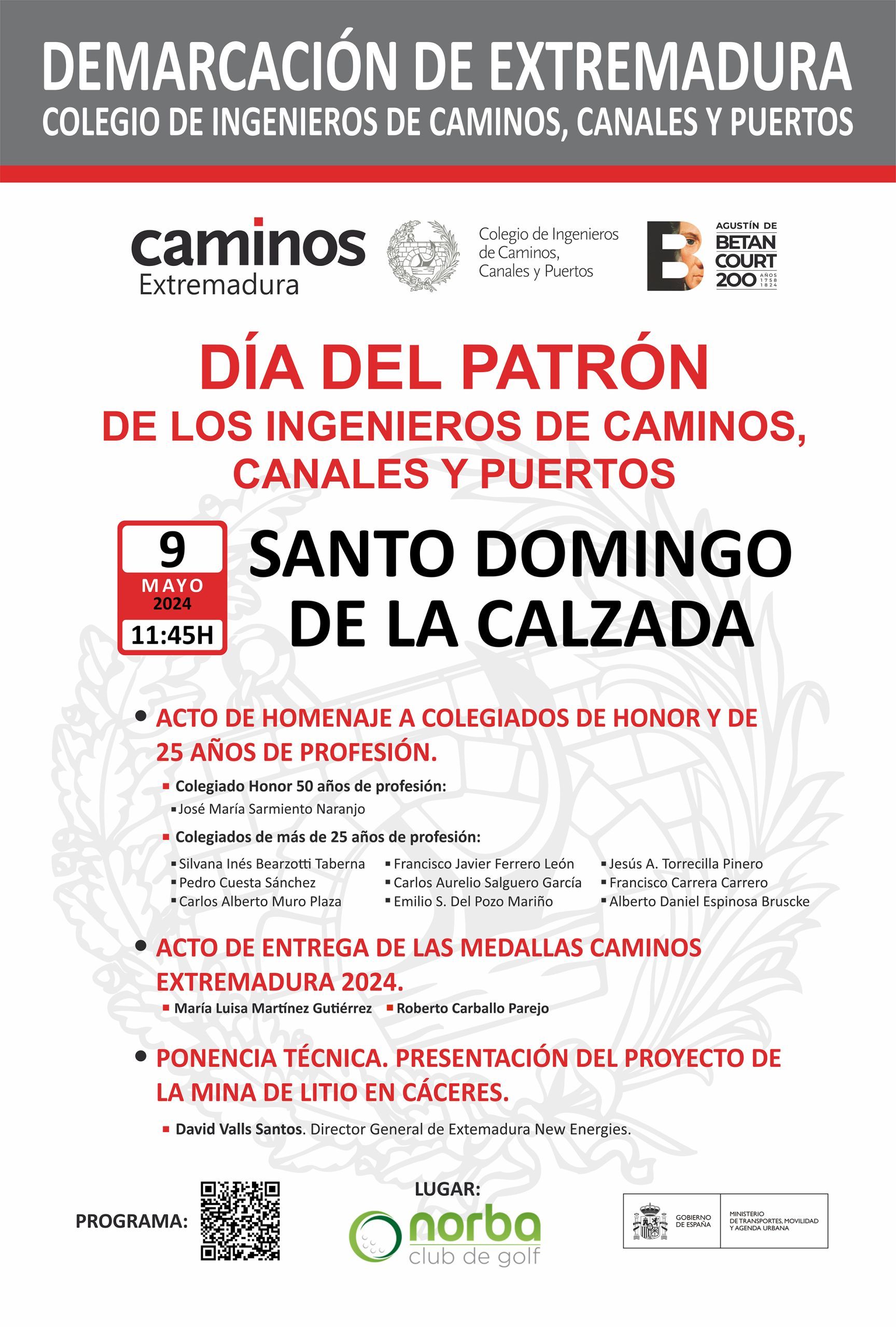 El próximo jueves 9 de mayo de 2024, la Demarcación de Extremadura del Colegio de Ingenieros de Caminos, Canales y Puertos (CICCP), va a llevar a cabo una Jornada con motivo de la celebración del día del patrón de la profesión, Santo Domingo de la Calzada.